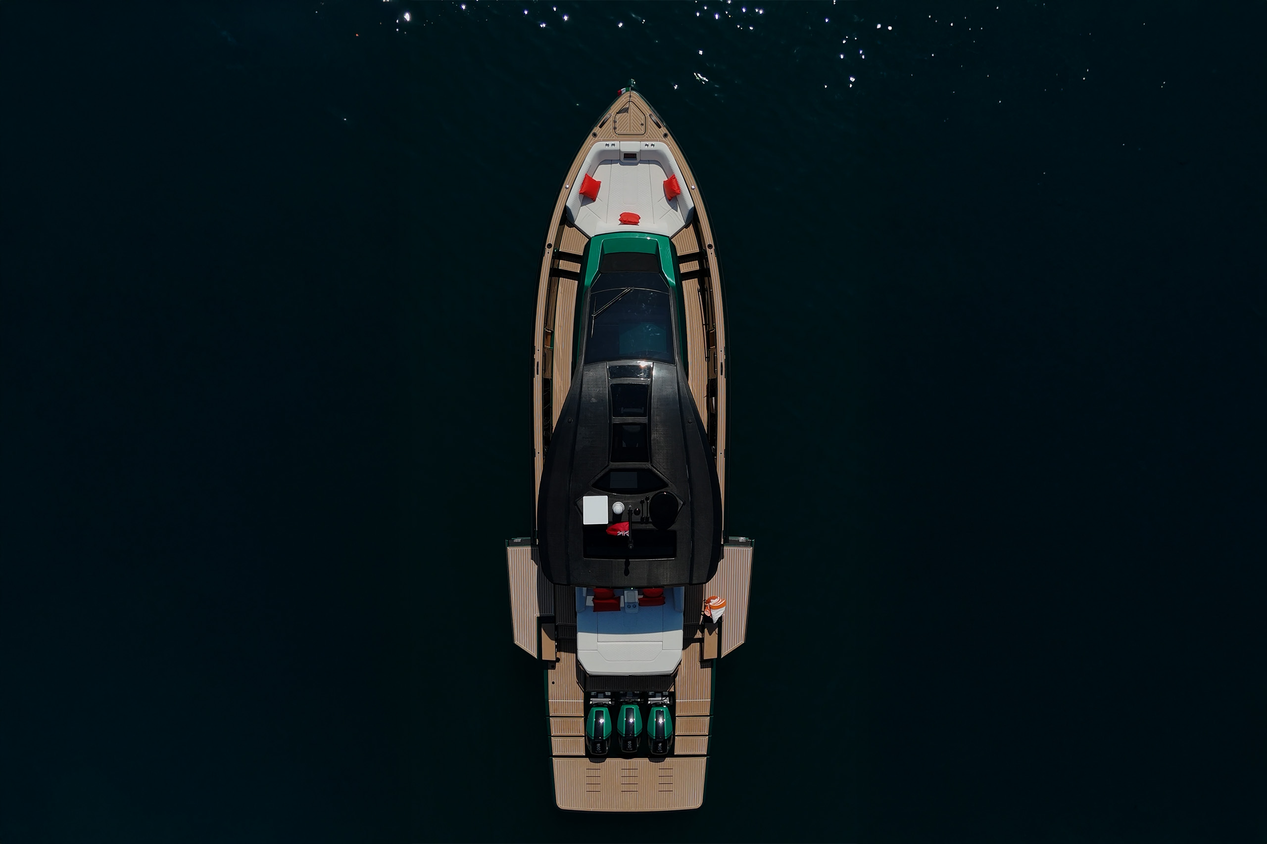 Il design esterno del T50 Speciale è caratterizzato da linee eleganti e moderne. Il layout walk around facilita la mobilità a bordo, mentre il fly bridge offre uno spazio ideale per il relax e l'intrattenimento. Le zone prendisole a prua e a poppa invitano a godere del sole in totale comfort. Il T-top in fibra di carbonio e la piattaforma da bagno estensibile aggiungono funzionalità e stile, rendendo il T50 Speciale una scelta ideale per chi cerca prestazioni eccellenti senza compromettere il lusso.